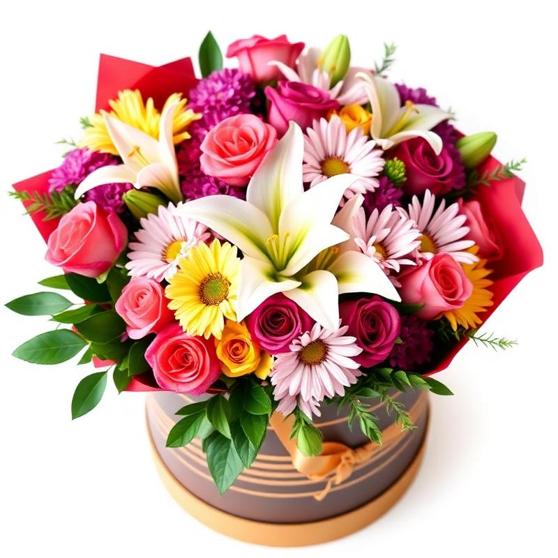 A vibrant luxury box arrangement featuring roses, lilies, daisies, and seasonal blooms. The perfect birthday surprise delivered same day across Dubai.